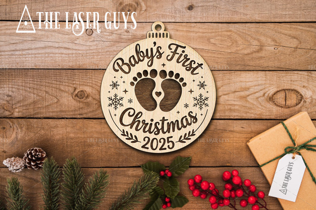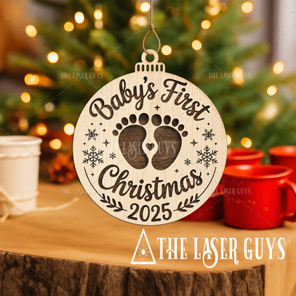 Crafted from sustainably sourced Baltic Birch, this ornament features the phrase “Baby’s First Christmas 2025” with tiny footprints surrounded by snowflakes and soft decorative accents. Measuring about 3.5" x 3.0" x 0.25", each piece is hand-sanded for a smooth natural finish and arrives ready to hang on your tree or tie onto a gift. Thoughtful and enduring, this keepsake is perfect for celebrating a new arrival or gifting to new parents as a cherished holiday tradition.