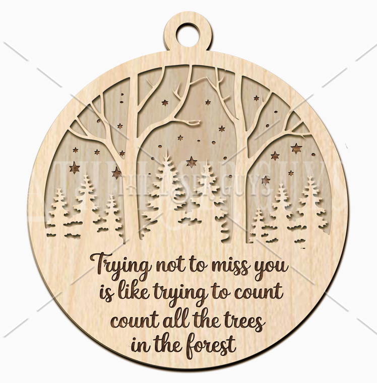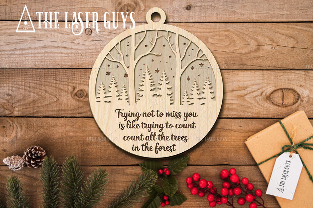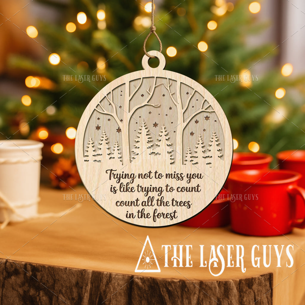 Crafted from sustainably sourced Baltic Birch, this ornament features an intricate woodland scene with tall trees and starry night sky details. Measuring about 4" x 3.6" x 0.25", each piece is hand-sanded for a smooth natural finish and arrives ready to hang on your tree or tie onto a gift. A meaningful addition to holiday décor, it serves as a touching tribute to loved ones who are deeply missed but always remembered.