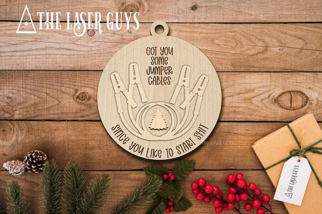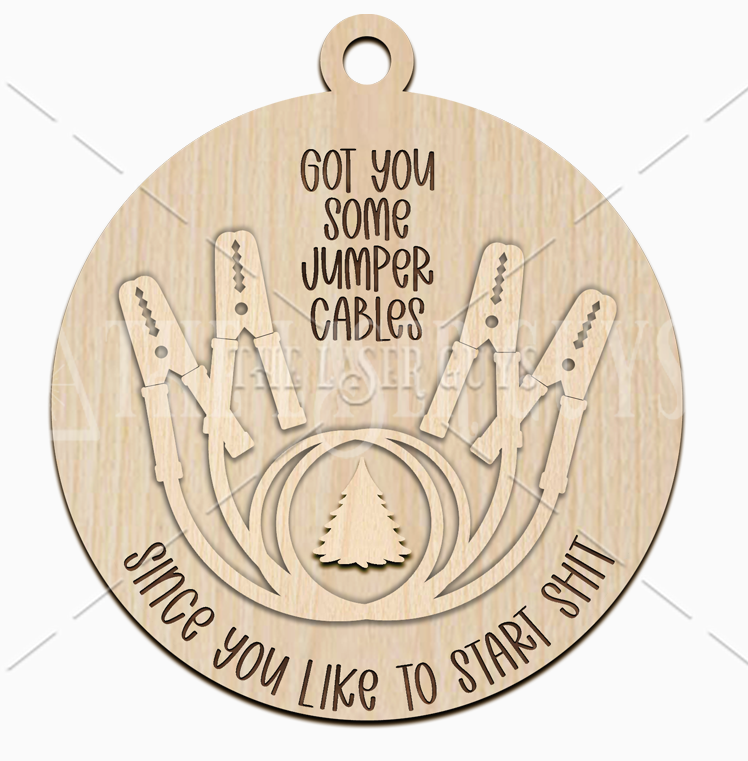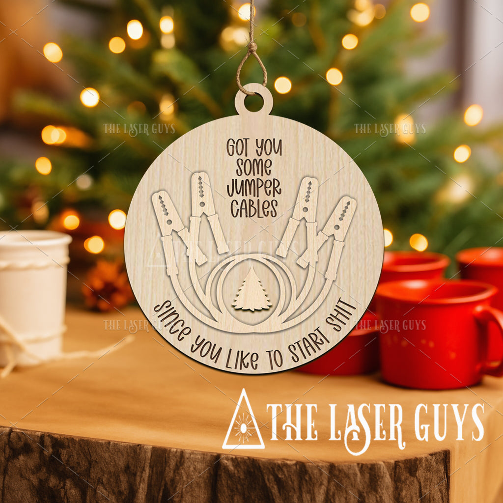 Crafted from sustainably sourced Baltic Birch, this ornament features a playful design of jumper cables wrapped around a Christmas tree cutout. Measuring about 4" x 3.6" x 0.25", each piece is hand-sanded for a smooth natural finish and arrives ready to hang on your tree or tie onto a gift. A lighthearted addition to holiday décor, it makes a hilarious stocking stuffer or gift for the one who loves to keep things interesting. Perfect for family, friends and co-workers.