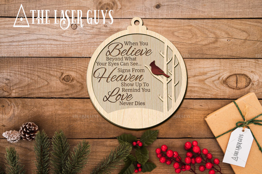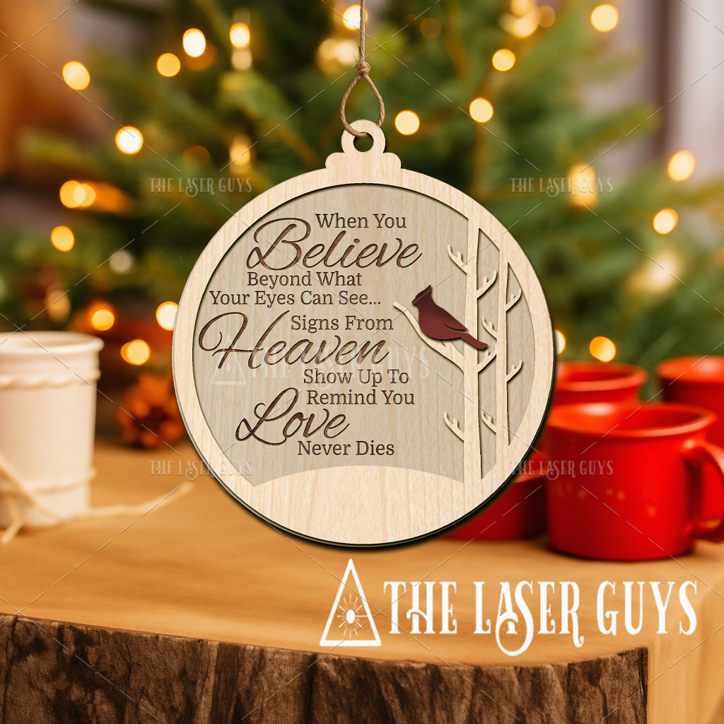 Crafted from sustainably sourced Baltic Birch, this ornament features a cardinal perched among bare winter trees with the touching phrase “When you believe beyond what your eyes can see… signs from heaven show up to remind you love never dies.” Measuring about 4.0" x 3.6" x 0.4", each piece is hand-sanded for a smooth natural finish and arrives ready to hang on your tree or tie onto a gift. A meaningful addition to your décor or a heartfelt gift, it serves as a lasting symbol of remembrance and the enduring power of love.