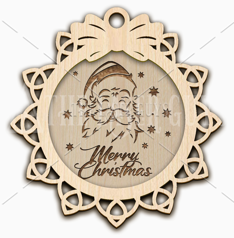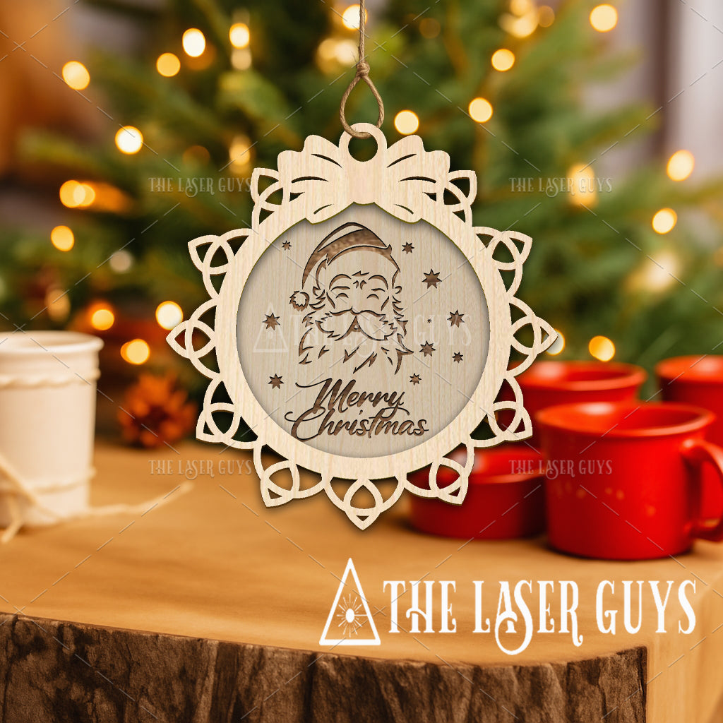 Crafted from sustainably sourced Baltic Birch, this elegant ornament features a classic Santa design framed with a delicate lace-style border and topped with a bow. The words “Merry Christmas” add the finishing touch of holiday cheer. Measuring about 4" x 3.8" x 0.25", each piece is hand-sanded for a smooth natural finish and arrives ready to hang. A perfect keepsake to celebrate the season, this ornament makes a thoughtful gift or a nostalgic addition to your own holiday décor.