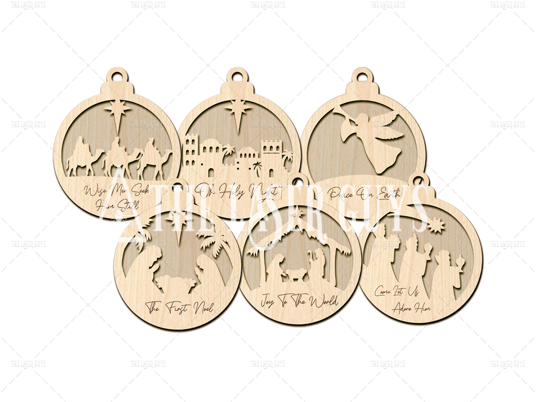 Crafted from sustainably sourced Baltic Birch, this six-piece ornament set includes: Wise Men Seek Him Still, Oh Holy Night, Peace on Earth, The First Noel, Joy to the World, and Come Let Us Adore Him. Each design measures about 3.8" x 3.2" x 0.25", is hand-sanded for a smooth natural finish, and arrives ready to hang on your tree or tie onto gifts. Perfect for Christian holiday décor and nativity ornament collections, this complete set offers a meaningful way to celebrate the season and makes an unforgettable gift of faith and tradition.