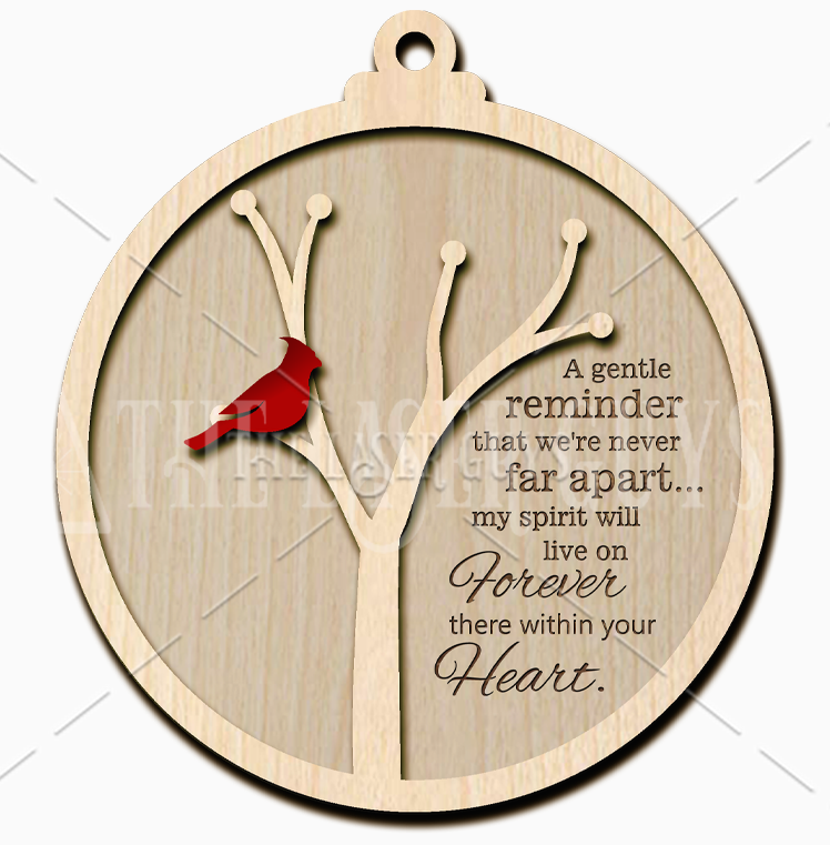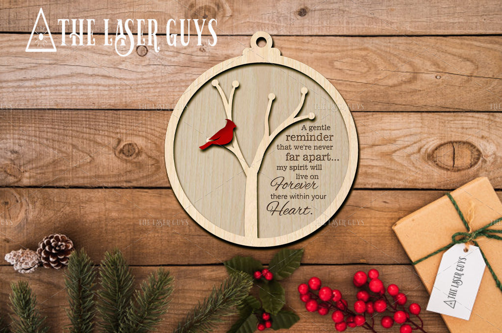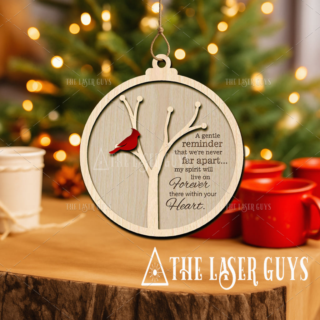 Crafted from sustainably sourced Baltic Birch, this ornament features a simple tree design with a red cardinal—a timeless symbol of remembrance—resting on its branch. Alongside it are the heartfelt words “A gentle reminder that we’re never far apart… my spirit will live on forever there within your heart.” Measuring about 4" x 3.6" x 0.4", each piece is hand-sanded for a smooth natural finish and arrives ready to hang on your tree or tie onto a gift. A meaningful keepsake for the holidays or any time of year, it serves as a gentle tribute to the love and spirit of those we carry with us always.