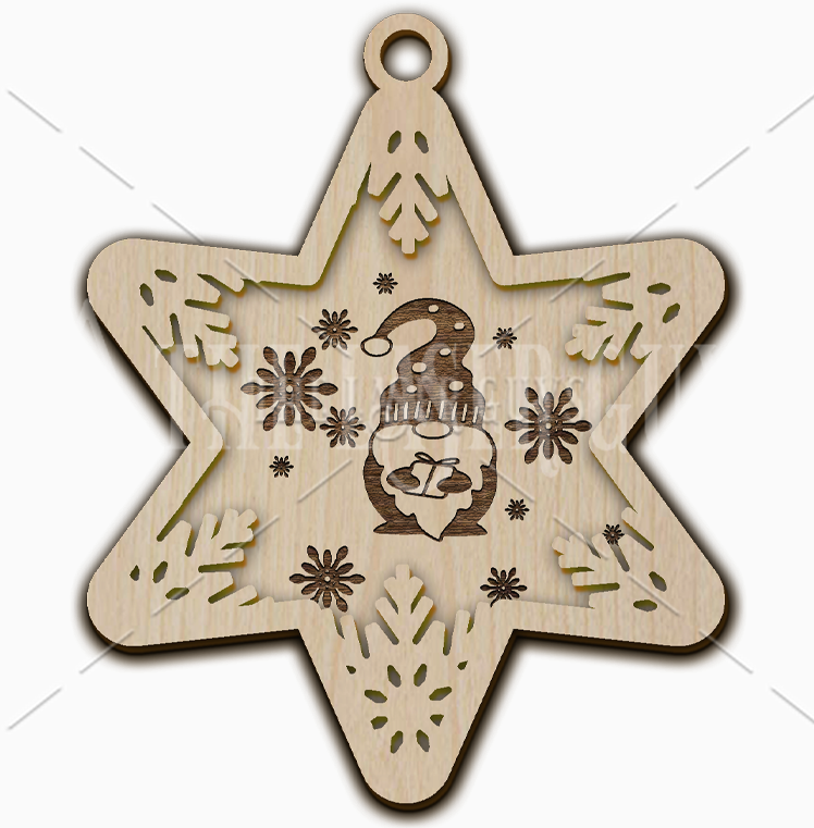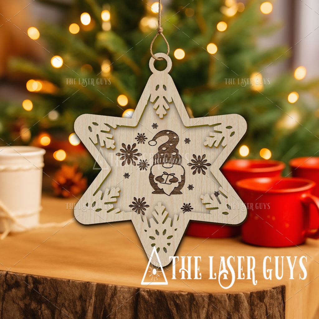 Crafted from sustainably sourced Baltic Birch, this ornament features a star-shaped snowflake design with a whimsical gnome at its center, surrounded by delicate snowflakes. Measuring about 4.1" x 3.4" x 0.25", each piece is hand-sanded for a smooth natural finish and arrives ready to hang on your tree or tie onto a gift. A delightful keepsake that blends nostalgia with charm, it makes a perfect addition to your holiday décor or a thoughtful gift for someone who loves a touch of whimsy.
