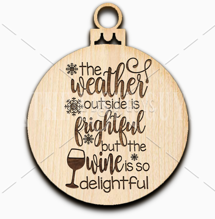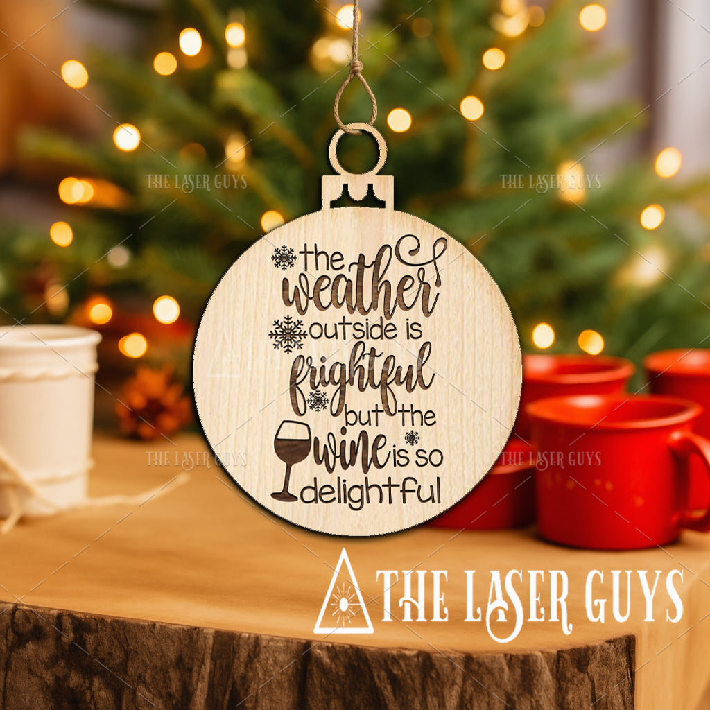 Crafted from sustainably sourced Baltic Birch, this ornament features the engraved phrase “The weather outside is frightful but the wine is so delightful” accented with snowflakes and wine glass designs. Measuring about 4.0" x 3.2" x 0.125", each piece is hand-sanded for a smooth natural finish and arrives ready to hang on your tree or tie onto a gift. A perfect stocking stuffer or hostess gift, this keepsake adds a splash of humor and festive spirit to any holiday celebration.