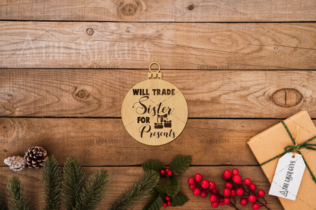 Let's face it, who didn't want to trade their sister at some point? Remind him that you choose him over a present with this whimsical keepsake ornament.