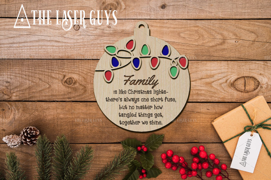 Crafted from sustainably sourced Baltic Birch, this ornament features a colorful string of Christmas lights wrapped across the top, paired with a witty saying about family’s quirks and glow. Measuring about4" x 3.7" x 0.25", each piece is hand-sanded for a smooth natural finish and arrives ready to hang on your tree or tie onto a gift. A cheerful keepsake, it’s the perfect way to celebrate the humor and warmth of family during the holiday season.