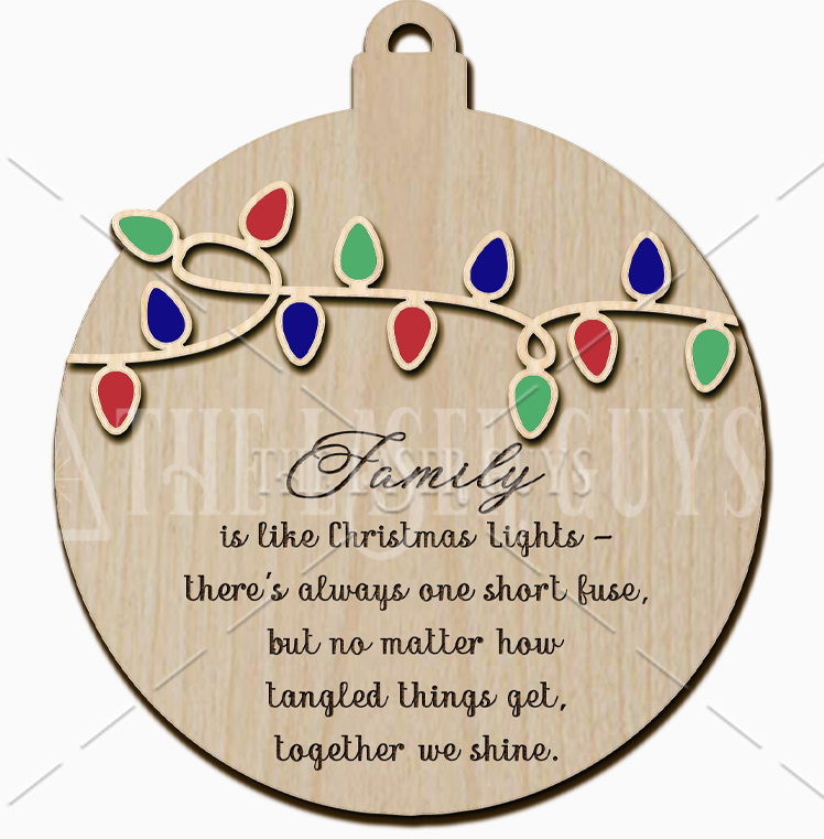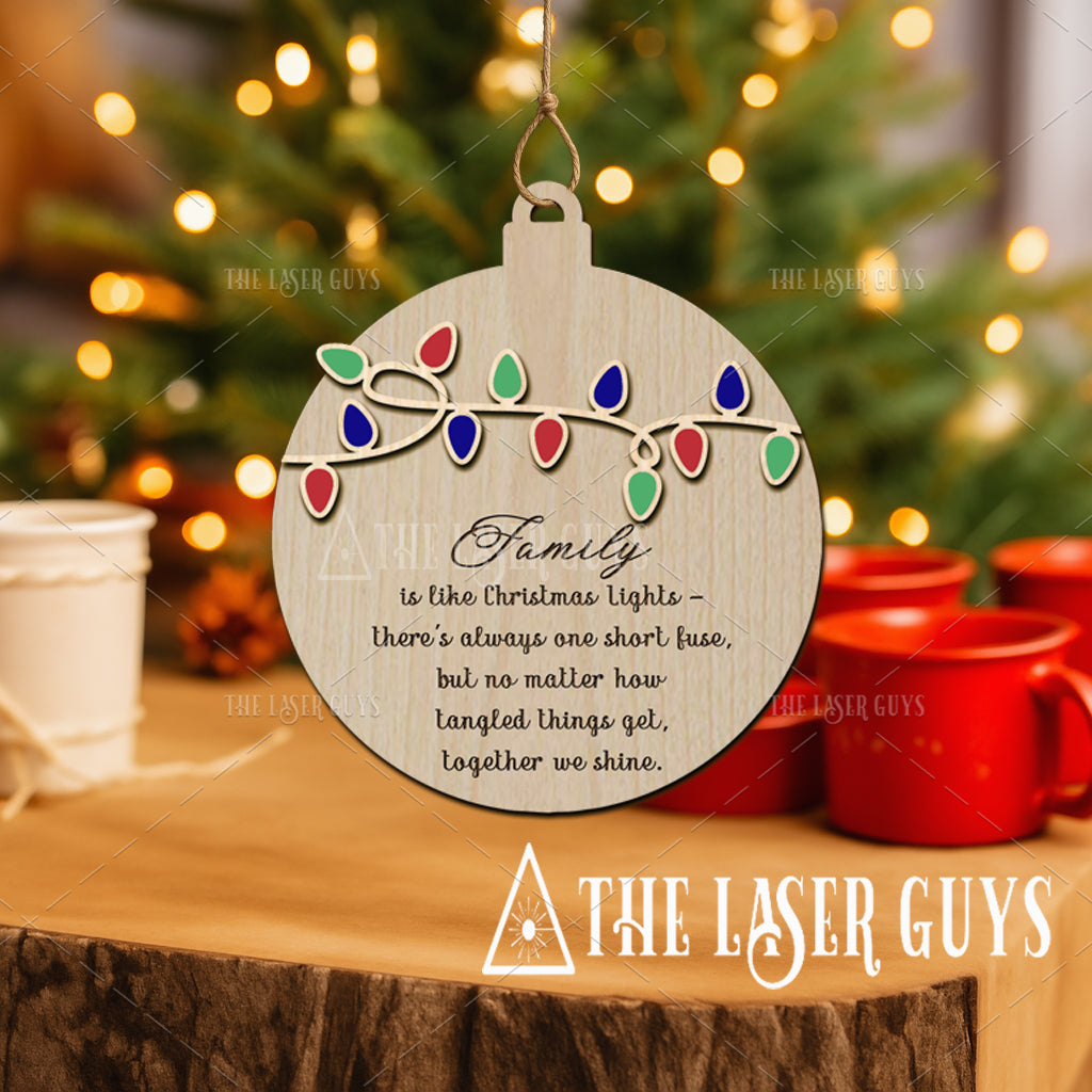 Crafted from sustainably sourced Baltic Birch, this ornament features a colorful string of Christmas lights wrapped across the top, paired with a witty saying about family’s quirks and glow. Measuring about4" x 3.7" x 0.25", each piece is hand-sanded for a smooth natural finish and arrives ready to hang on your tree or tie onto a gift. A cheerful keepsake, it’s the perfect way to celebrate the humor and warmth of family during the holiday season.
