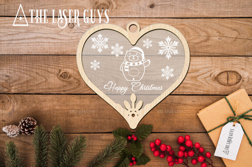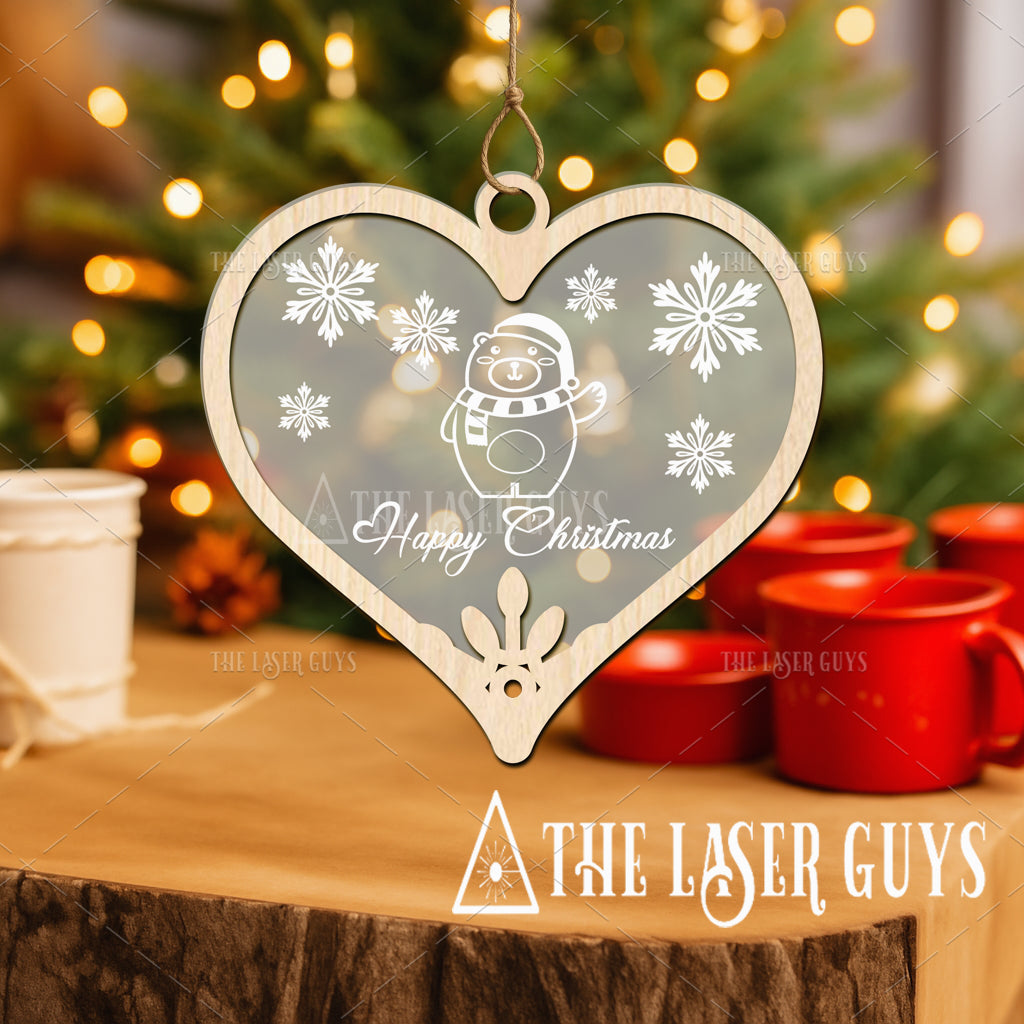 Crafted from sustainably sourced Baltic Birch with a frosted acrylic center, this ornament features the phrase “Happy Christmas” alongside a cheerful bear bundled in a scarf, framed within a heart-shaped design. Measuring about 3.0" x 3.2" x 0.175", each piece is hand-sanded for a smooth natural finish and arrives ready to hang on your tree or tie onto a gift. A charming keepsake for children, families, or anyone who loves whimsical décor, it makes a thoughtful gift or a heartwarming addition to your own collection.